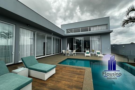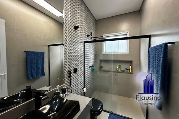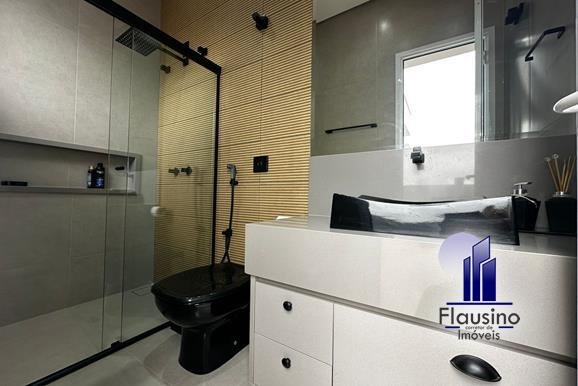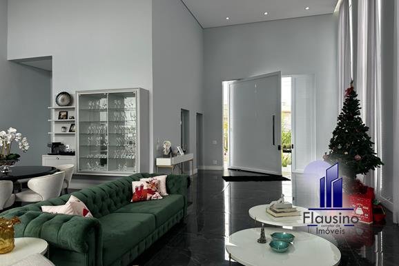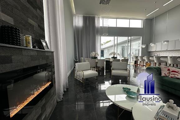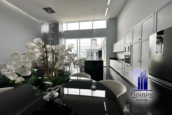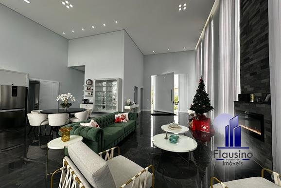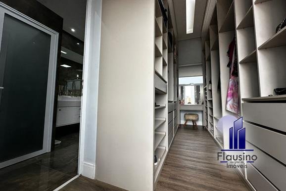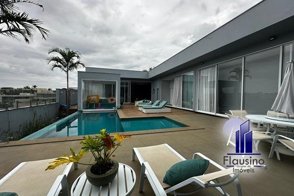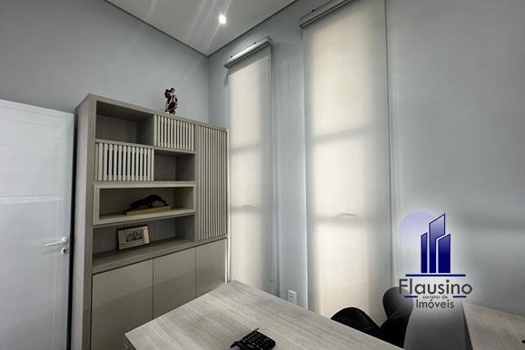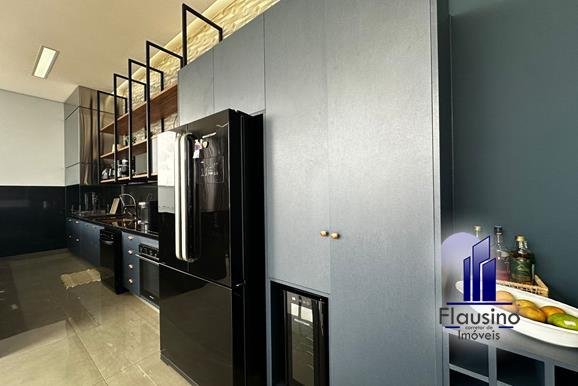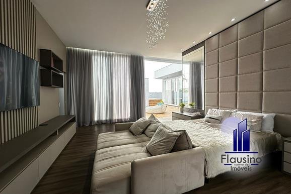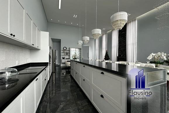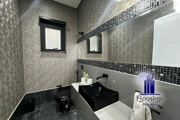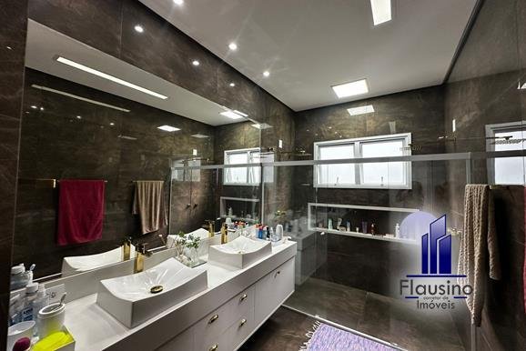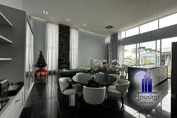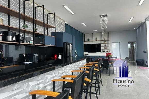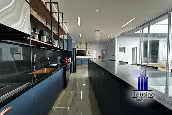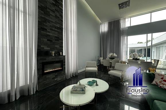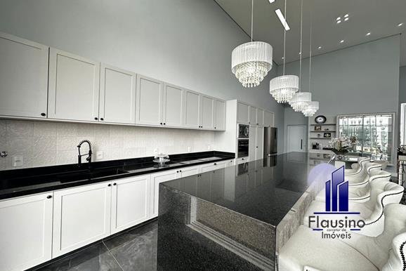 ÁREA COMUM: – fachada imponente com 25 metros de frente – garagem coberta para 3 carros e descoberta para 2 carros – paisagismo – escada imponente revestida com pedra São Gabriel escovado – lavabo com papel de parede, espelho, pendentes, cuba de sobrepor – escritório todo planejado com cortinas sob medida – sala ampla para 3 ambientes com pé direito de 7 metros, porta em alumínio com 3 metros de altura fechadura eletrônica, cortinas feitas sob medida, lustre, lareira elétrica toda revestida em pedra vulcânica, cristaleira com armário embutido – cozinha estilo americana toda planejada com bancada em ilha, fogão de indução, forno e microondas de embutir, porta em esquadrias de alumínio branca, vista para piscina – rouparia toda planejada