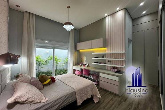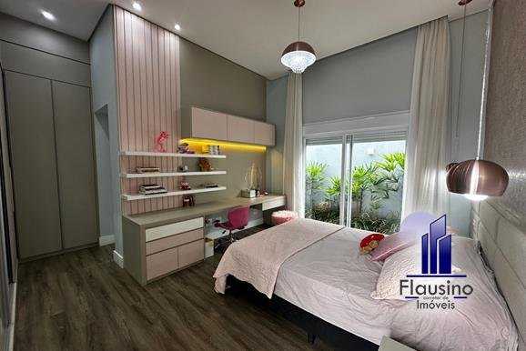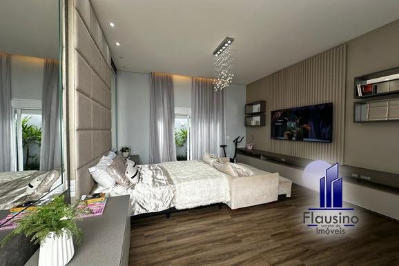 4 SUÍTES AMPLAS SENDO: – 3 suítes com quartos todos planejados com armários, espelhos, mesa, painel, criados, cabeceiras, papel de parede, cortinas feitas sob medida, todas portas automatizadas, acesso ao jardim, lustre e pendentes, banheiros com box, armário, espelho, nicho, chuveiro, torneira e acessórios linha gold – suíte master ampla com painel planejado, com nichos, criados, papel de parede, cortina ampla feita sob medida automatizada, porta automatizada com acesso ao jardim, closet todo planejado, banheiro com dois chuveiros, duas cubas, armários, espelho, box, todos acessórios linha gold