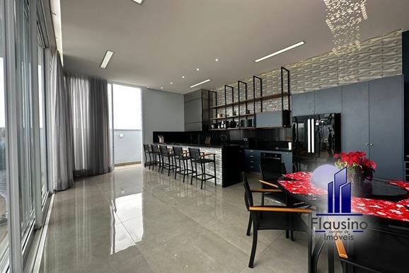 ÁREA DE FESTAS: – área descoberta revestida com porcelanato amadeirado – área gourmet com vista, portas em esquadrias de alumínio, cortinas feitas sob medida automatizadas, lustre, bancadas em granito, toda planejada com marcenaria na cor azul petróleo, torneira de cuba da linha gold, churrasqueira a carvão com chapa elétrica, coifa, forno de embutir, prateleiras suspensas – sala conjugada com área gourmet com painel, aparador, nichos suspensos – banheiro com box, nicho, espelho, armário, cuba de sobrepor – banheiro externo com armário, espelho, box – lavanderia toda planejada com bancadas de passar roupa